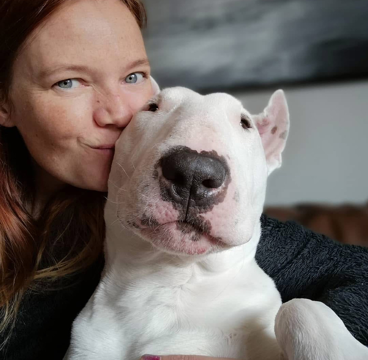 Her worldwide recognised trademark of the white bull terrier face was inspired by her heart dog Kasper, who always accompanied her in her creative journey and remains a beloved muse in her art pieces.